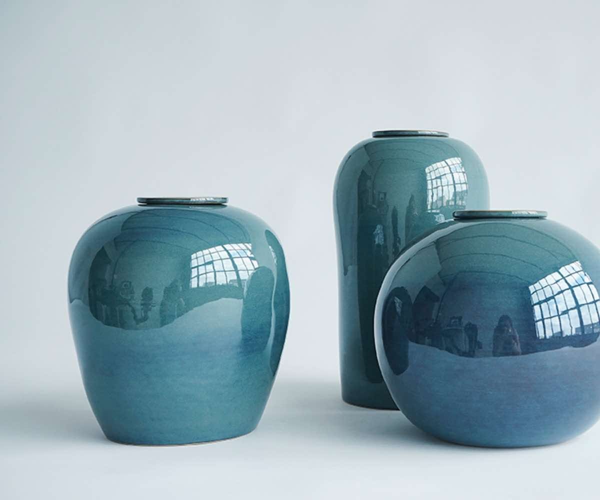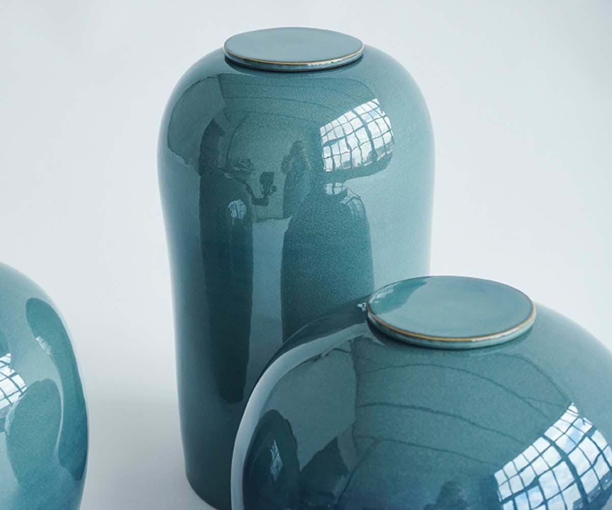 De urnen zijn afgewerkt met een hoog‑reactief glazuur en op hoge temperatuur gebakken. Hierdoor vertoont elke urn unieke schakeringen: sommige zijn meer egaal groen, terwijl andere varianten prachtige nuances van blauw en azuur laten zien. Dit maakt elke urn exclusief en persoonlijk.