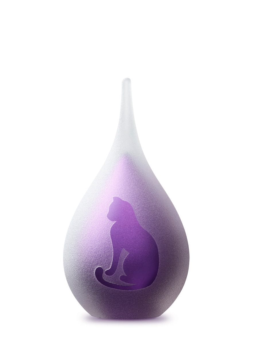 De Dierenurn Kat Paars druppel is een liefdevolle en stijlvolle herinnering aan uw trouwe huisdier. Deze handgemaakte dierenurn kat paars is vervaardigd van hoogwaardig glas en met zorg gevormd door vakmensen. Deze elegante dierenurn heeft een frosted (mat) buitenkant, wat zorgt voor een zachte, rustgevende uitstraling. De diepe paarse kleur staat symbool voor troost, waardigheid en verbondenheid, en geeft de urn een serene en stijlvolle uitstraling.