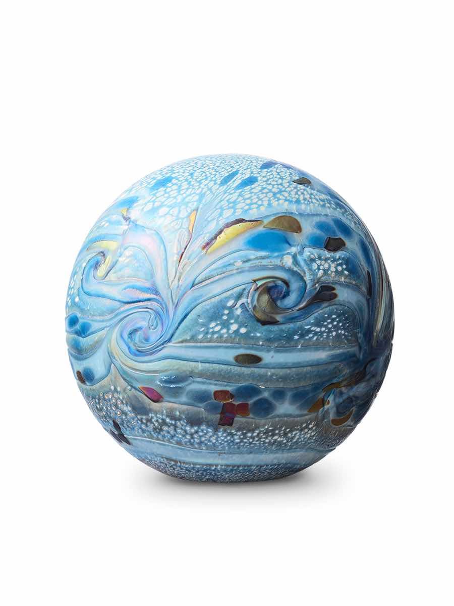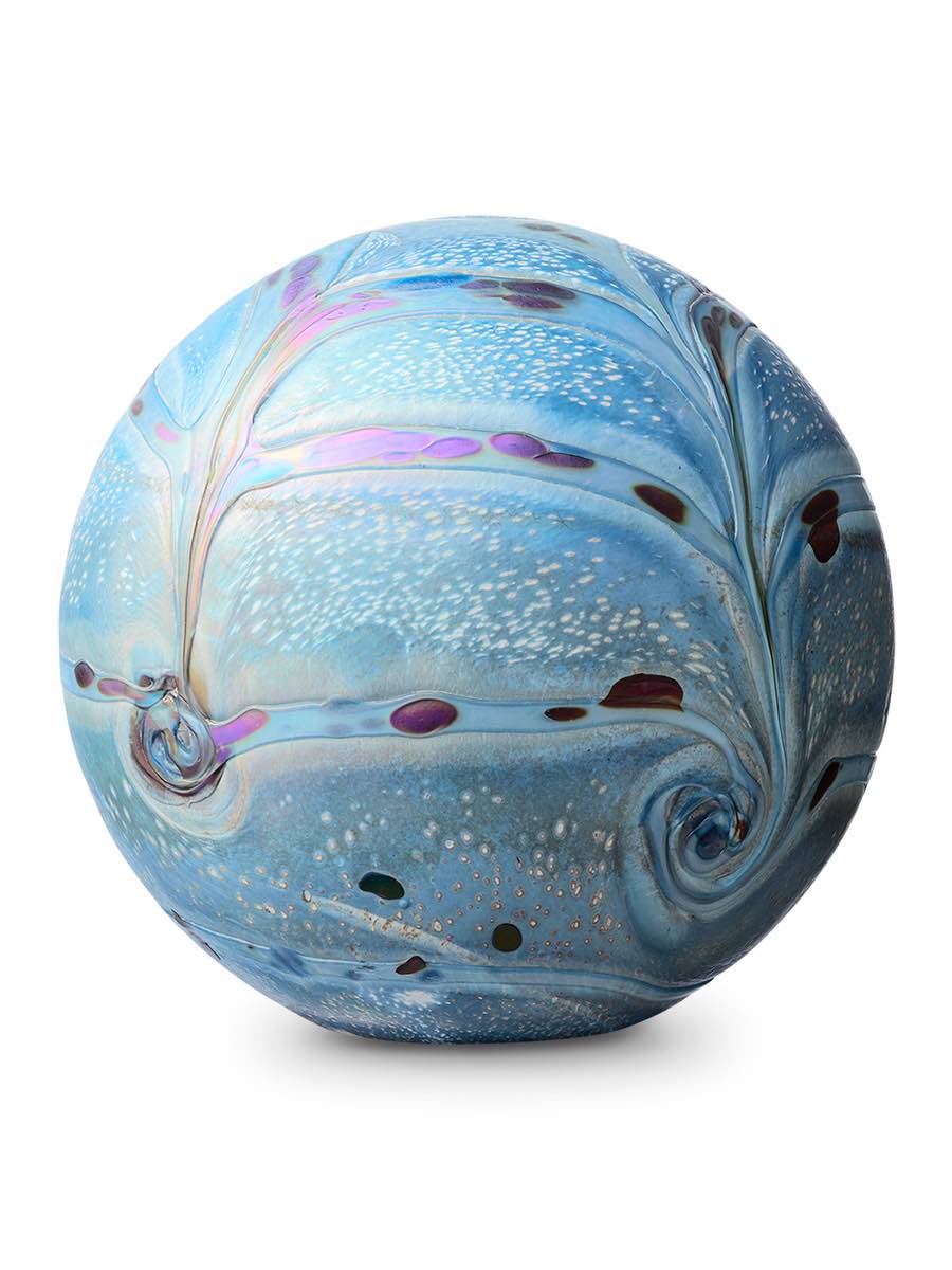 De glazen urn heeft een elegante, bolvormige vorm met subtiele parelmoerglans en een fijn reliëf dat het licht zacht weerkaatst. Binnenin bevindt zich een afgesloten as-reservoir, waarin het volledige crematie-as veilig bewaard kan worden. De glazen urn wordt zorgvuldig afgesloten met een zelf-hechtende sluitplaat en is niet transparant, zodat het as niet zichtbaar is.