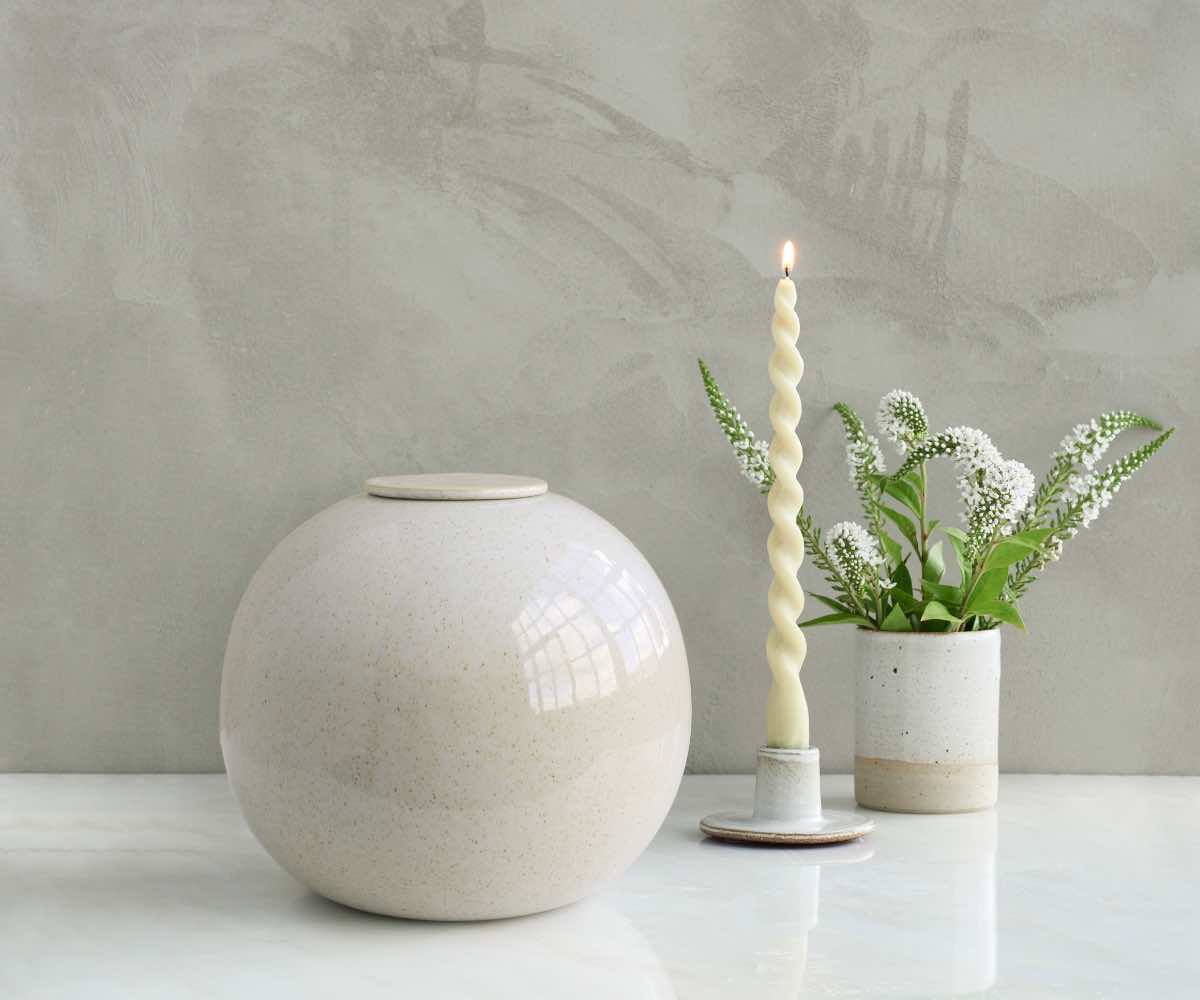 De Keramische Urn Wit Aardetint is een tijdloze, bolvormige urn van 3,8 liter, zorgvuldig met de hand vervaardigd uit hoogwaardig wit keramiek. De subtiele spikkeltjes en natuurlijke schakeringen in aardetinten geven deze urn een serene en pure uitstraling. Deze elegante urn biedt een waardige en rustgevende plek om de as van een dierbare te bewaren.